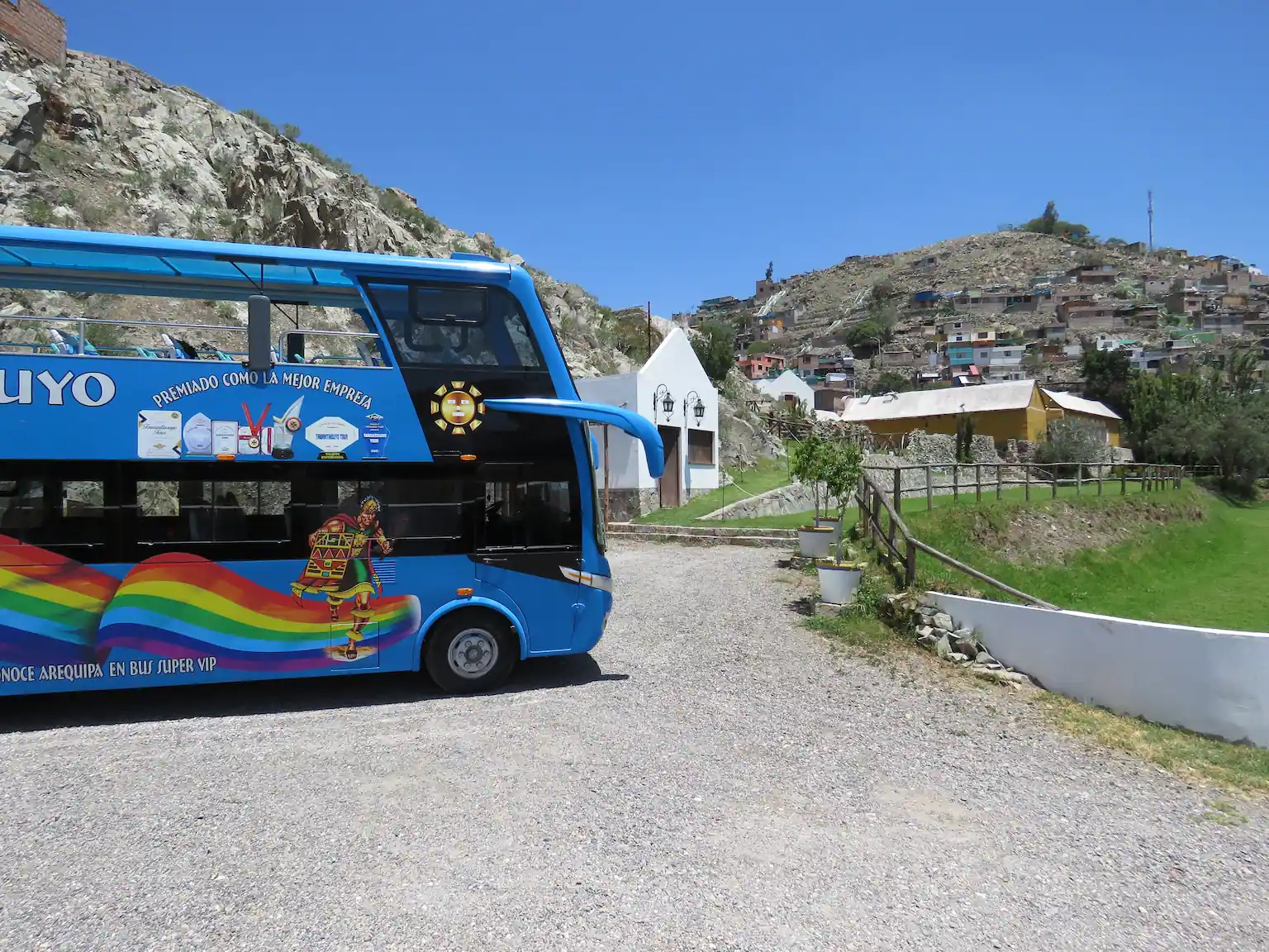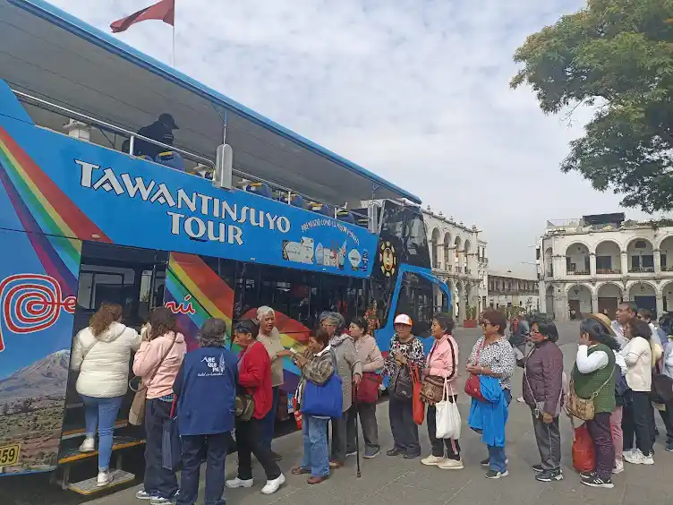 Recojo del lugar indicado, para luego abordar el bus, Visita por el centro histórico; continuaremos hacia el tradicional y emblemático Mirador de Yanahuara; luego iremos al Mirador de Carmen Alto, donde se tiene una linda vista del valle del Chili con el fondo de los volcanes Misti y Chachani; continuando con nuestro recorrido llegaremos al Outlet de la Fabrica de tejidos Incalpaca ubicado en el distrito de Sachaca donde visitaremos el Mini Zoológico que se encuentra en su interior, y apreciaremos ejemplares de los cuatro camélidos sudamericanos (llama, alpaca, vicuña y guanaco); luego nos dirigiremos a Tiabaya para visitar la hermosa casa museo “Villa San Rafael”, continuando con nuestro recorrido ingresaremos al Distrito de Hunter y apreciaremos la campiña arequipeña a lo largo de la Vía Paisajista y luego al “Molino de Sabandía” que data del año 1785 donde se pueden apreciar las técnicas utilizadas para procesar el trigo utilizando los molinos de piedra, casi finalizando el recorrido visitaremos un pequeño museo llamado MENELIK, donde se apreciara maquetas de toros de pelea para que se tomen fotografías, ya de retorno al centro pasamos por los Andenes de Paucarpata los que recrean un sistema de microclimas permitiendo el cultivo de variedad de productos en cada uno de sus graderías. Y finalizando retornaremos a la ciudad y los dejaremos en el lugar indicado.